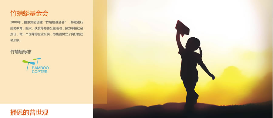 播恩于2008年創(chuàng)建“竹蜻蜓慈善”。持續(xù)進行捐助教育、賑災(zāi)、扶貧等慈善公益活動,努力承擔社會責任,做一個優(yōu)秀的企業(yè)公民,為播恩樹立了良好的社會形象。