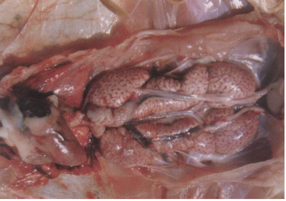 2.2.3腎型傳支:主要見(jiàn)于20~50日齡的仔雞,病初呼吸困難(但較呼吸型輕微),2~4天后消失,羽毛逆立。隨后急劇下痢呈米湯樣白色稀糞;腎臟腫大蒼白,呈檳榔狀花紋(俗稱(chēng)檳榔腎),輸尿管內(nèi)充滿(mǎn)白色尿酸鹽。病程15天左右死亡率高。