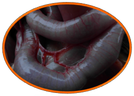 2.3.2 腸道:剖檢可見小腸粘膜肥厚,充血,可見蟲體吸附于小腸粘膜上。寄生部位呈針尖大結(jié)節(jié)樣病變,中央凹陷。大量蟲體聚集時(shí),引起腸堵塞,可造成腸破裂和腹膜炎。嚴(yán)重時(shí)導(dǎo)致死亡。見圖4。