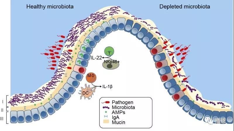 從下圖可以看出,左側(cè)的腸黏膜特點為存在致病微生物(Pathogen,紅色小蝌蚪狀),還存在豐富的益生菌(Microbiota,小螞蟻狀),只有很少的致病微生物進(jìn)入粘蛋白層(Mucin,黃色部分),而且在粘蛋白層內(nèi)存在豐富的抗菌肽(AMPS,紅色小圓點)和免疫球蛋白A(IgA),此外免疫細(xì)胞T細(xì)胞也已被激活。而右側(cè),益生菌很少,這樣就無法誘導(dǎo)腸黏膜上皮細(xì)胞產(chǎn)生足夠的粘蛋白,薄的粘蛋白層起到的物理屏障就弱。