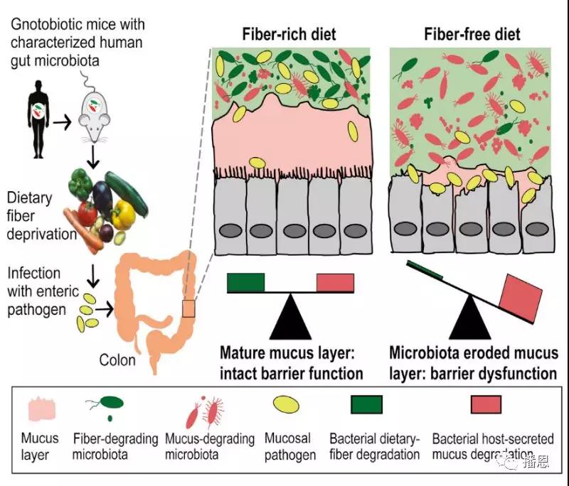 而飼喂大鼠缺乏膳食纖維的日糧(Fiber-freediet)時,腸道黏膜的粘蛋白含量很少,形成的“墻”很薄,此時腸黏膜的屏障能力很差,而且致病微生物也已經(jīng)開始侵蝕腸上皮細(xì)胞。因此,給“二師兄”補充膳食纖維也是一種行之有效的提高“二師兄”“內(nèi)在修為”的途徑。
