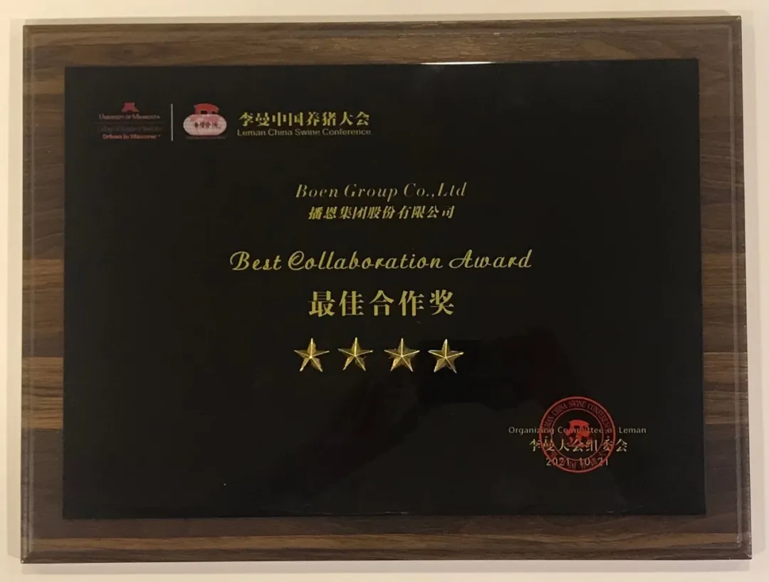 2021年10月20-22日,第十屆李曼中國養(yǎng)豬大會暨世界豬業(yè)博覽會在重慶國際博覽中心舉行。大會期間,播恩集團(tuán)領(lǐng)取了李曼大會組委會頒發(fā)的“最佳合作獎”。