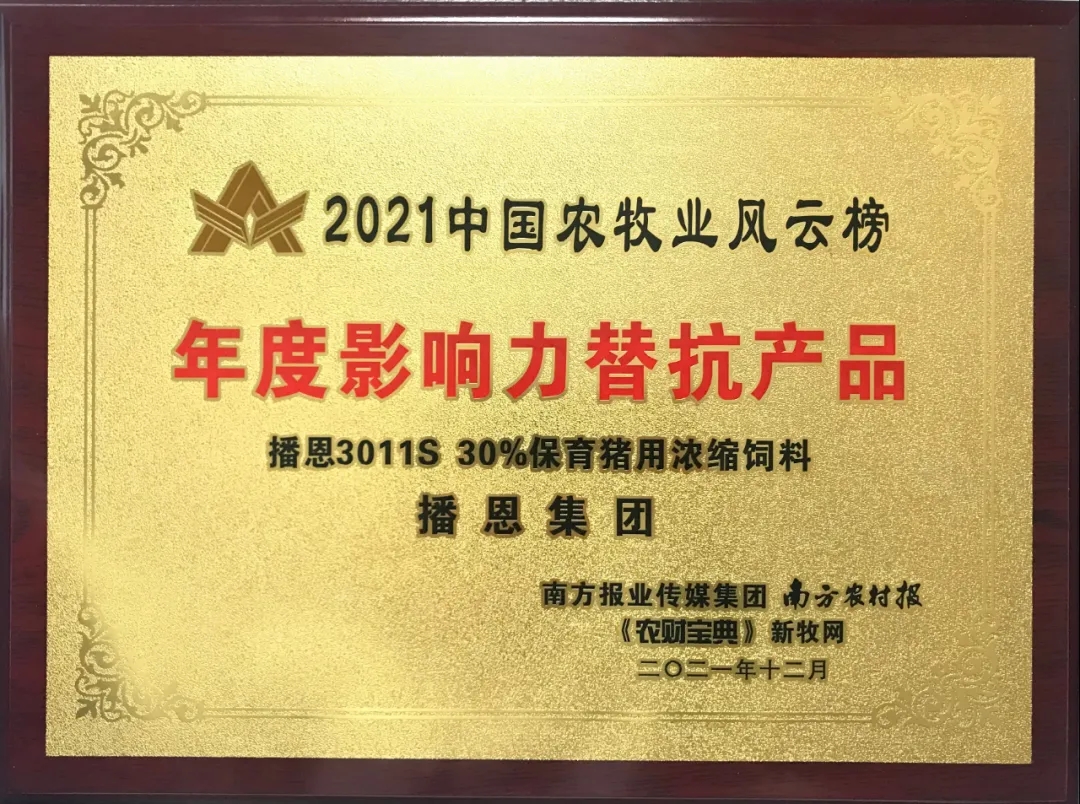 2021年12月11日,第11屆中國農(nóng)牧業(yè)風(fēng)云會(huì)、農(nóng)財(cái)寶典新牧網(wǎng)年會(huì)暨廣東省現(xiàn)代畜禽產(chǎn)業(yè)園研討會(huì)在廣州閉幕。在2021年中國農(nóng)牧業(yè)風(fēng)云榜頒獎(jiǎng)會(huì)上,播恩集團(tuán)產(chǎn)品“播恩3011S 30%保育豬用濃縮飼料”榮獲“年度影響力替抗產(chǎn)品”獎(jiǎng)項(xiàng),播恩集團(tuán)技術(shù)服務(wù)副總監(jiān)巴少波上臺(tái)領(lǐng)取獲獎(jiǎng)牌匾。