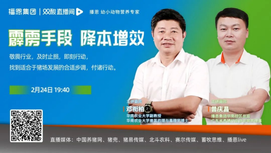 2月24日晚19:40,32萬+養(yǎng)豬網(wǎng)友齊聚播恩雙酸直播間,共同觀看了第三十三期訪談式直播《霹靂手段 降本增效》,本期直播邀請(qǐng)了華南農(nóng)業(yè)大學(xué)副教授/獸醫(yī)藥理與毒理學(xué)博士鄧銜柏與播恩集團(tuán)華南戰(zhàn)區(qū)總監(jiān)/廣東省養(yǎng)豬行業(yè)協(xié)會(huì)常務(wù)理事曾慶昌,期間中國(guó)養(yǎng)豬網(wǎng)、豬兜、豬易傳媒、北斗農(nóng)科、賽爾傳媒、蓄牧思維、播恩live七大平臺(tái)進(jìn)行同步轉(zhuǎn)播,鄧?yán)蠋?、曾總從技術(shù)與市場(chǎng)角度為著力點(diǎn),通過實(shí)際案例、媒體數(shù)據(jù)進(jìn)行觀點(diǎn)的闡述、交流,為網(wǎng)友們答疑解惑。