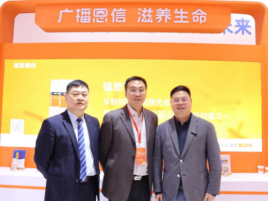 廣東省飼料行業(yè)協(xié)會會長蔣宗勇(圖左三)、協(xié)會秘書長張永發(fā)(圖右一)、協(xié)會專職副秘書長周洪(圖左二)一行蒞臨播恩展位參觀指導